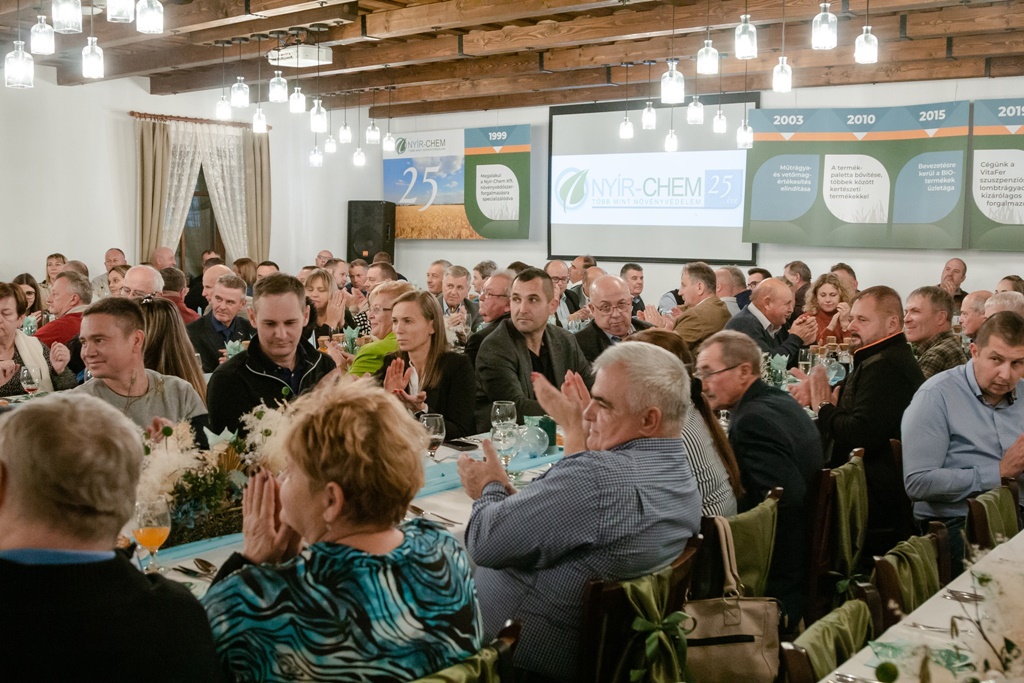 „38 oklevelet adtunk át 25. születésnapunk alkalmából. 38 olyan partnerünknek, akik több évtizede, a kezdetektől velünk vannak. A jó üzleti kapcsolatok mára már sokszor barátivá is váltak az évek alatt, ezeket a jó viszonyokat pedig oklevelek átadásával is szerettük volna elismerni. Ez olyan érték, ami szerintünk unikális és igyekszünk megőrizni a következő évtizedekben is” – emelte ki a Nyír-Chem Kft. ügyvezetője. A rendezvény egy vacsorával folytatódott, amelyet Badár Sándor előadása kísért. A színművész sajátos humora, rögtönzései és nem utolsósorban jellegzetes figurája széleskörben mosolyt csalt a vendégek arcára. A társaságot ezt követően a Tűzvirág Együttes mozgatta meg. A kéttagú zenekar több mint 10 év tapasztalatával, fiatalos dinamizmussal, valamint minden korosztály zenei igényét kielégítő repertoárjával éjszakába nyúlóan muzsikált.