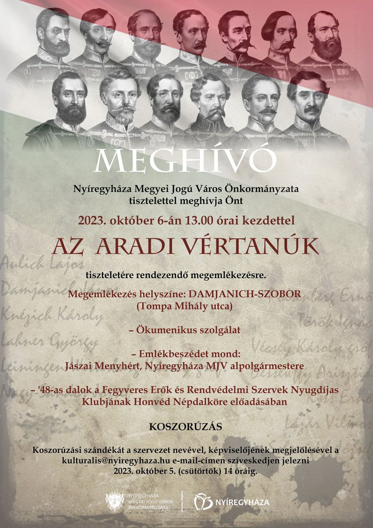 Október hatodikán, délután 13:00-án a Damjanich szobornál tartja az önkormányzat a hivatalos megemlékezést. Az ökumenikus szolgálat után beszédet mond Jászai Menyhért, Nyíregyháza alpolgármestere, majd 148as dalok csendülnek fel a Fegyveres Erők és Rendvédelmi Szervek Nyugdíjas Klubjának Honvéd Népdalköre előadásában. A megemlékezés koszorúzással zárul